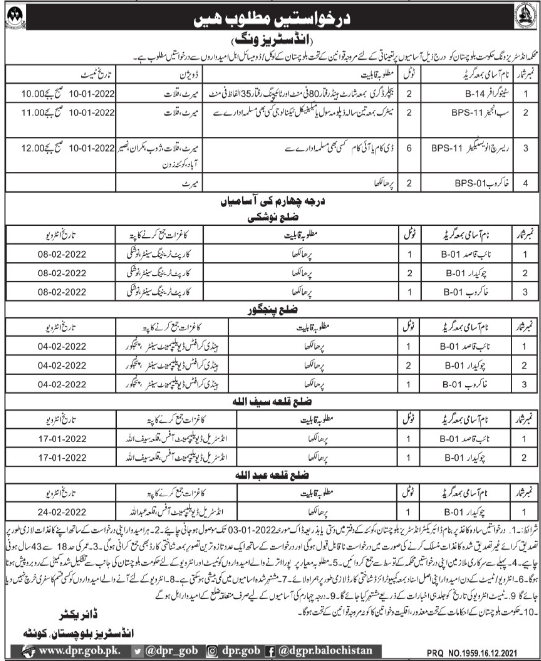 Government of Balochistan, Small Industries Department invites applications from highly qualified, motivated, experienced and professional candidates for the vacant positions of Instructor Designing, Instructor Sewing, Lady Demonstrator, Instructor Knitting, Instructor Cutting, Chowkidar, Naib Qasid.