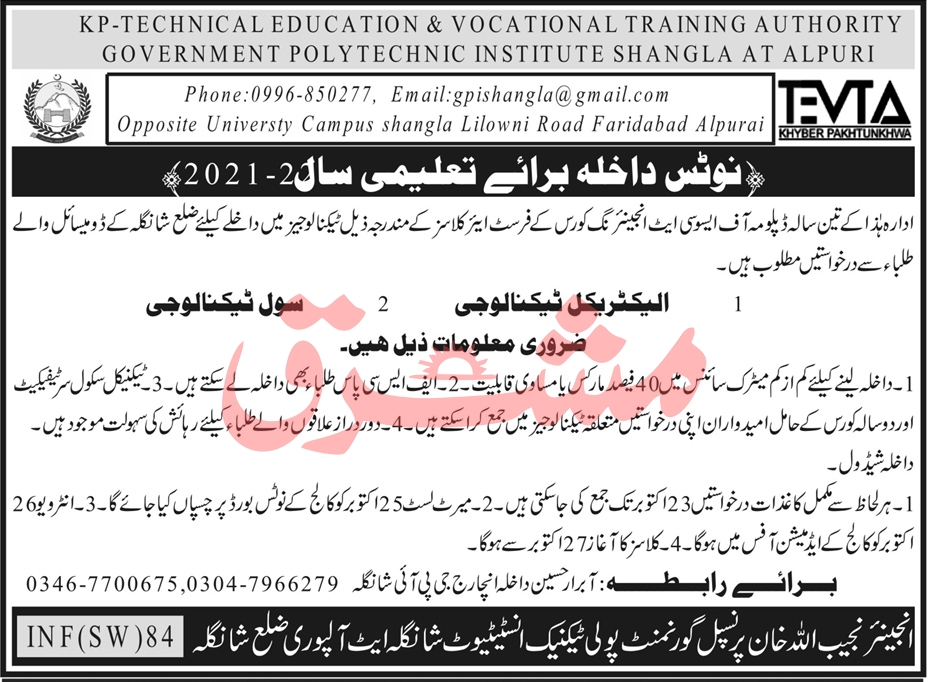 Government Polytechnic Institute, Shangla KPK has announced the admissions in Diploma of Associate Engineer in DAE Electrical Technology and DAE Civil Technology. Read newspaper ad for exact details.