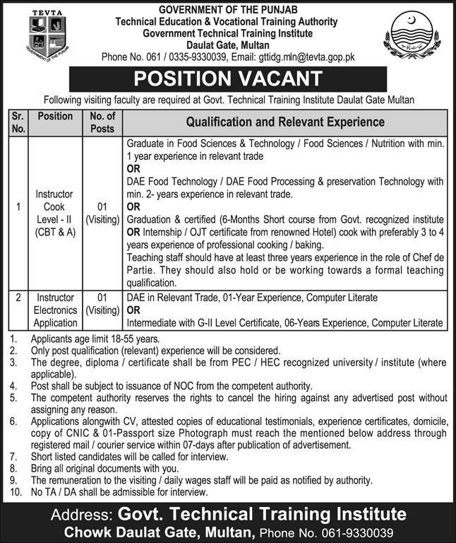Govt Technical Training Institute GTTI Daulat Gate, Technical Education & Vocational Training Authority TEVTA jobs advertisement dated about 21 March 2024 in daily Express Newspaper invites application for the vacant post of instructor electronics application, instructor cook and instructor in Multan, multan Punjab Pakistan. DAE, Intermediate, Bachelor and BA etc. educational qualification will be preferred.