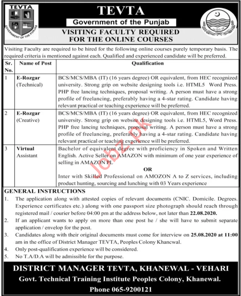 Govt Technical Training Institute Peoples Colony Khanewal, Technical Education & Vocational Training Authority TEVTA, Government of the Punjab is seeking candidates for the posts of Instructor, Technical Instructor, E Rozgar Instructor, Creative Instructor, Virtual Assistant.