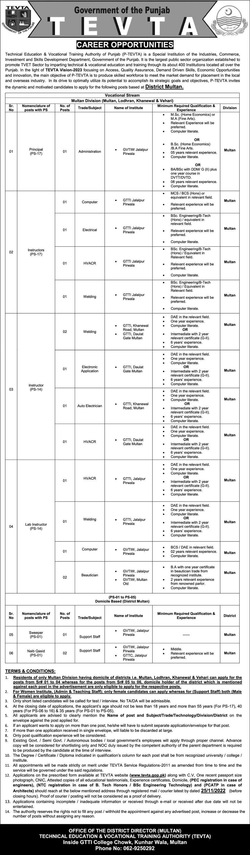 Technical Education & Vocational Training Authority TEVTA Multan, lodhran, khanewal and vehari Punjab Pakistan invites applications from eligible candidates for the post of auto electrician, computer instructor, instructor, electronic application instructor, beautician, hvacr instructor, support staff, welding instructor, naib qasid, lab instructor, sweeper, electrical instructor and principal as per advertisement of November 1, 2022 published in daily Express Newspaper. Preferred Education is Others, Intermediate, B.E, BCS, Middle, Bachelor, Master, MA, MCS, DAE, M.sc and BA etc.