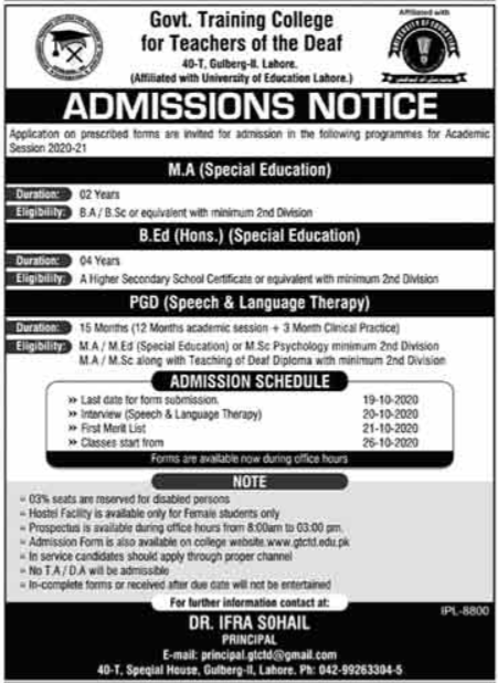 Government Training College For Teachers of the Deaf affiliated with University of Education Lahore is offering admissions in MA Special Education, B.Ed Hons Special Education & Post Graduate Diploma Speech & Language Therapy. Read newspaper ad for exact details.