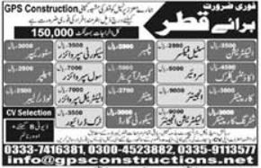 GPS Construction Qatar, qatar Qatar invites applications from eligible candidates for the post of security supervisor, truck driver, store keeper, labor, plumber, helper, civil supervisor, shuttering carpenter, electrician engineer, steel fixer, computer operator, accounts clerk, loader, electrical supervisor, electrician, surveyor, security guard, carpenter, painter and engineer as per advertisement of February 18, 2023 published in daily Khabrain Newspaper. Candidates with Others, Intermediate, Master, Bachelor, Matric, Middle and DAE etc. educational background will be preferred.
