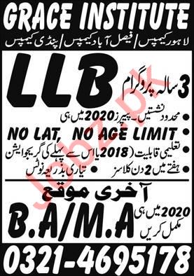 Grace Institute of Science & Technology Lahore, Pakistan is starting admissions fall 2020 for the classes of LLB Bachelor of Law 3 Years Degree Programs, BA, MA. Read newspaper ad for exact details.
