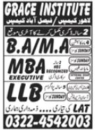 Grace Institute of Science & Technology has announced admissions in BA, MA, MBA Executive, Bachelor of Laws LLB degree programs in Lahore Campus & Faisalabad Campus. Read newspaper ad for exact details.
