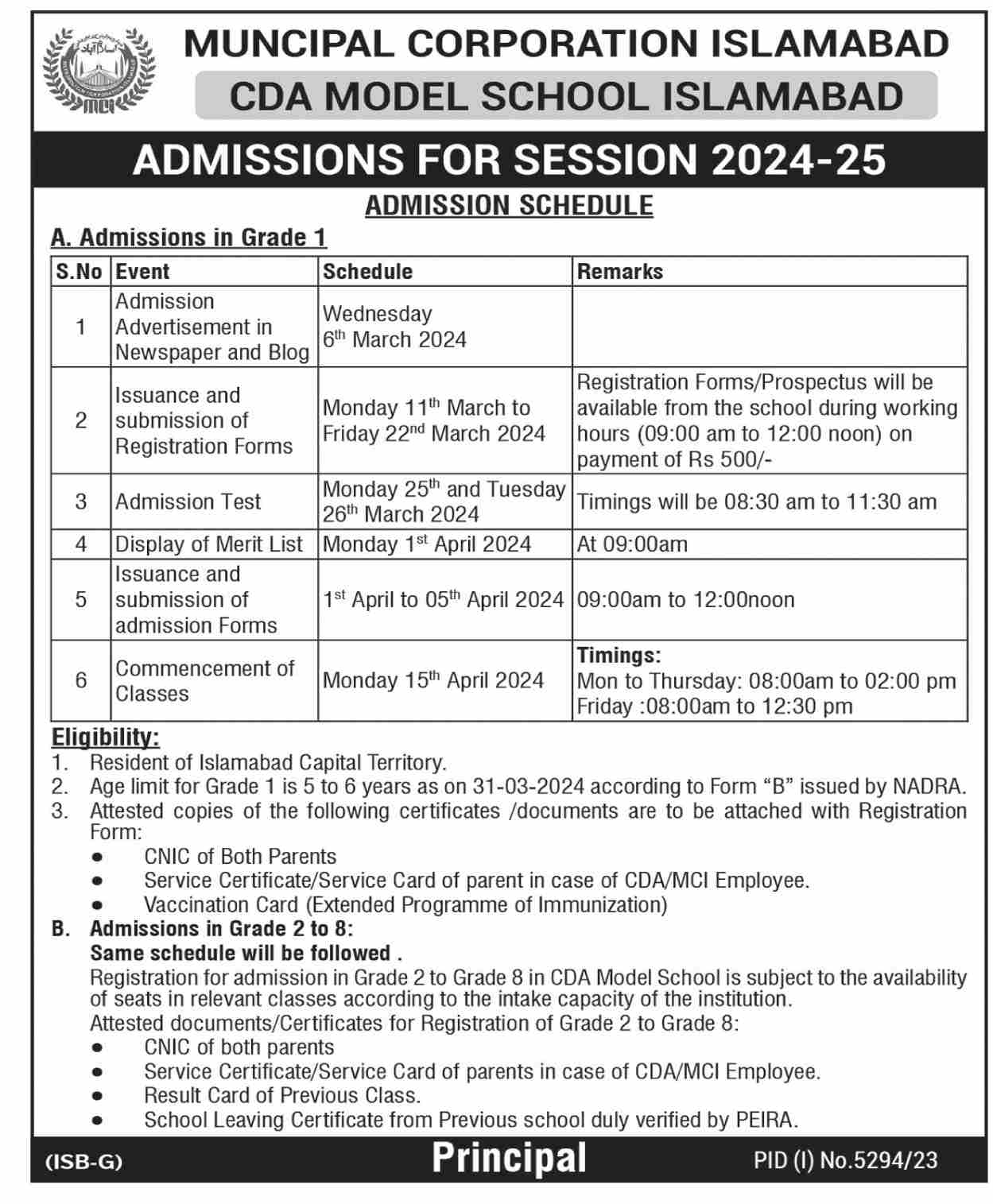 CDA Model School Grade 1 admissions 2024 has been started. CDA Model School Islamabad Islamabad Pakistan welcomes students to apply for admissions in academic year 2024 in Management School. Students for admissions in Primary & criteria can apply as per Government institute admission policy 2024 before closing date April 5, 2024 as per advertisement. Read newspaper ad for exact details.