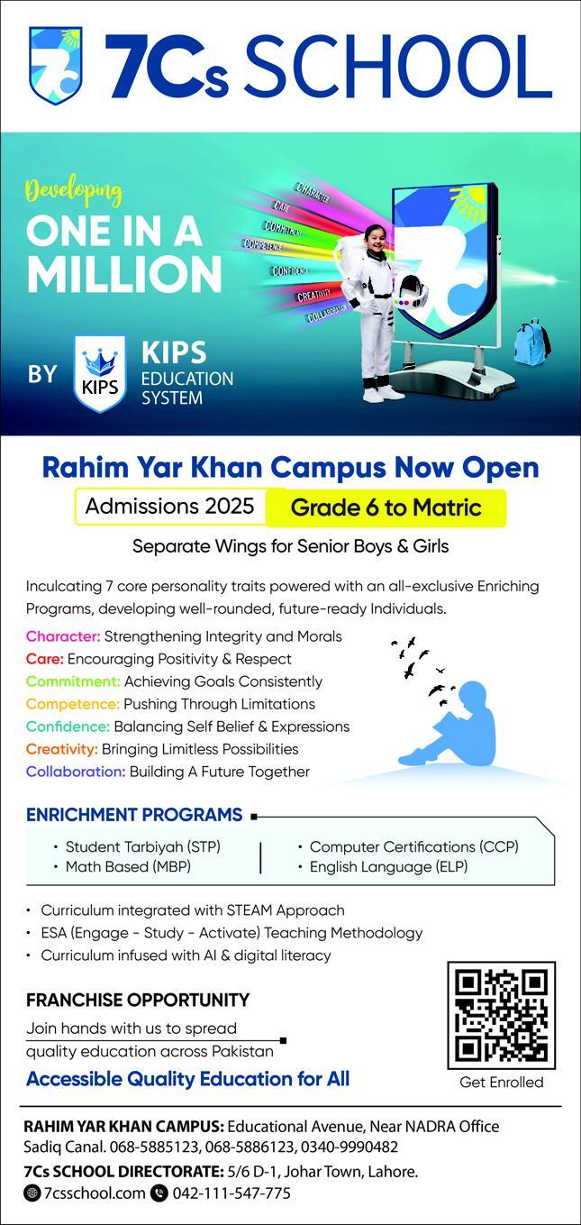 KIPS Education System Matric admissions 2025 has been announced. Students who want to take admissions in KIPS Education System Lahore Punjab Pakistan for academic year 2025 to continue education in Science School can apply. Students for admissions in & criteria can apply as per Government institute admission policy 2025 before closing date as per advertisement. Read newspaper ad for exact details.
