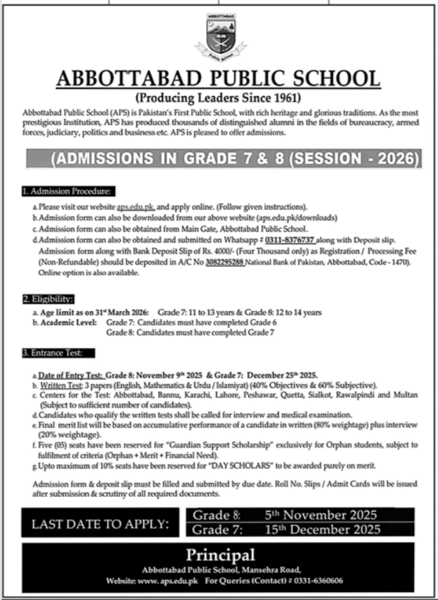 Abbottabad Public School Grade 7TH, 8TH admissions 2025 has been announced. Abbottabad Public School Peshawar Khyber Pakhtunkhwa KPK Pakistan welcomes students to apply for admissions in academic year 2025 in Science School. Eligible students for fulfilling criteria for admissions in can enroll as per Government admission policy 2025 till closing date. Read newspaper ad for exact details.