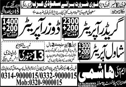MI Hashmi Overseas Employment Promoters Saudi Arabia Saudi Arabia invites applications from eligible candidates for the post of Shawl Operator, Doors Operator and Grader Operator as per advertisement of January 12, 2022 published in daily Express Newspaper. Persons with Intermediate and Matric etc. education can apply.