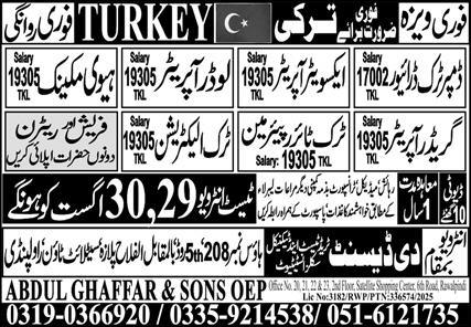 Vacant posts including truck electrician, excavator operator, dumper truck driver, heavy mechanic, loader operator, truck tyre repairman and grader operator are announced in The Descent Trade Test Center Istanbul, ankara Turkey as per 26 August 2025 advertisement in daily Express Newspaper. Bachelor, Intermediate, Matric and DAE etc. educational qualification will be preferred.