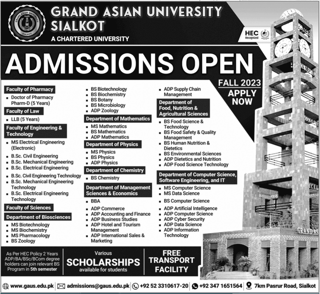 Grand Asian University has announced admissions 2023 for Associate Degree Program ADP, BS, MS, & DPT Doctor of Physical Therapy. Eligible students can apply for academic admissions 2023 in Grand Asian University Sialkot Punjab Pakistan for Science University. Students for admissions in ADP, DPT, MS and BS can apply for online or campus classes as per Private institute criteria till admission closing date July 30, 2023. Read newspaper ad for exact details.