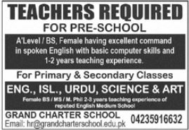 Grand Charter School is looking for candidates for following posts as per job advertisement published in daily Jang Newspaper of August 11, 2024 for location Lahore, lahore Punjab Pakistan: