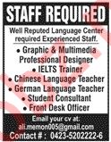 A Well Known Private Language Center in Karachi is looking for qualified, expert and Well-Mannered staff for their Organization for the Job of Graphic & Multimedia Professional Designer, IELTS Trainer, Chinese Language Teacher, German Language Teacher, Student Consultant and Front Desk Officer.