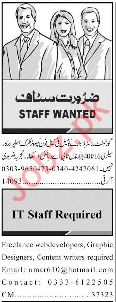 Graphic Designer, Hardware Technicians, Software Engineer, Computer Programmer, Computer Operator, Data Entry Operator, Male/ Female Executives, Salesman, Female Marketing Staff, Sales Staff, Computer Operator, Sales Manager and Sales Officer seeks in well reputed companies.