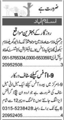 Private Company jobs advertisement dated about 15 November 2024 in daily Express Newspaper invites application for the vacant post of office staff, office boy, security guard, electrician, chowkidar, house worker, cook, driver, receptionist and graphic designer in Islamabad, islamabad Islamabad Pakistan. Persons with Middle, Bachelor, Intermediate, Matric and BA etc. education can apply.