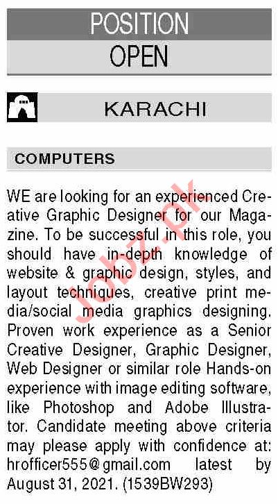 Web Designer, Graphic Designer, Hardware Technician, SEO, Search Engine Optimization Expert, Social Media Expert, Content Creator, Grahic Designer, Video Editor, Receptionist, Software Engineer, Computer Programmer, Computer Operator seeks in well reputed companies.
