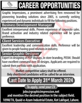 Graphic Impressions Lahore, lahore Punjab Pakistan invites applications from eligible candidates for the post of client service executive, graphic designer and business development manager as per advertisement of March 17, 2024 published in daily Jang Newspaper. Educational qualifications required MS, Bachelor and Master etc.