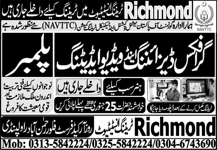 Admissions in Richmond Training Institute 2025 for graphic has been announced. Richmond Training Institute Rawalpindi Punjab Pakistan welcomes students to apply for admissions in academic year 2025 in Marketing Sales College. Students who want to enroll for academic session 2025 in qualification and admission criteria for Private institute can apply till last date. Read newspaper ad for exact details.