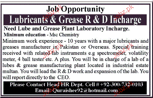 Grease Plant And Lab Incharge Job Opportunity
