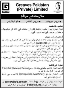 Greaves Pakistan Pvt Limited jobs advertisement dated about 11 August 2024 in daily Jang Newspaper invites application for the vacant post of service supervisor, auto electrician and service technician in Quetta, quetta Balochistan Pakistan. Intermediate, Bachelor and DAE etc. educational qualification will be preferred.