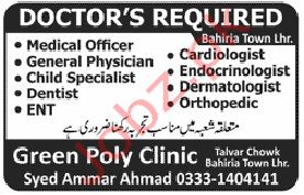 Green Poly Clinic Lahore is urgently looking for highly qualified, competent and experienced candidates for the following vacant positions. Medical Officer, General Physician, Child Specialist, Dentist, ENT Specialist, Cardiologist, Endocrinologist, Dermatologist, Orthopedic.