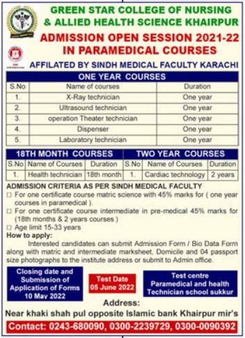 Green Star College of Nursing admissions 2022 for X Ray Technician, Ultrasound Technician, Operation Theater Technician, Dispenser, Laboratory Technician has been announced. Green Star College of Nursing Khairpur Sindh Pakistan welcomes students to apply for admissions in academic year 2022 in Medical Medical College. Eligible students for fulfilling criteria for admissions in Course can enroll as per Private admission policy 2022 till closing date 10 May 2022. Read newspaper ad for exact details.