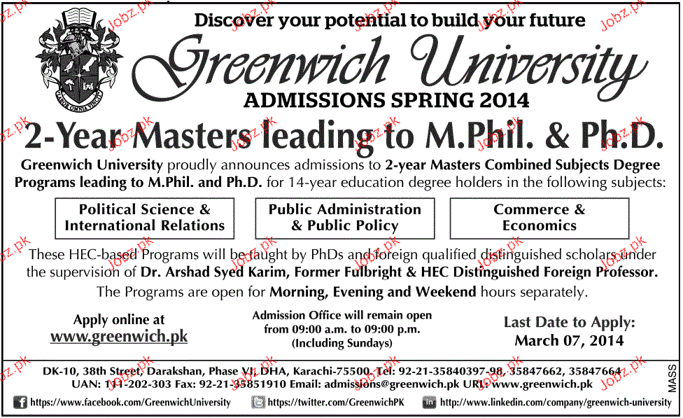 Greenrich University Admission in MA, Mphill and Phd in Karachi Read newspaper ad for exact details.
