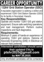 Vacant posts including grid station operator are announced in Private Company Lahore, lahore Punjab Pakistan as per 11 May 2025 advertisement in daily Jang Newspaper. Preferred Education is Matric, DAE, Intermediate and Bachelor etc.