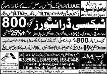 Group Abu Abdullah HR Consultants Abu Dhabi, abu dhabi UAE invites applications from eligible candidates for the post of taxi driver as per advertisement of February 6, 2023 published in daily Express Newspaper. Candidates with Primary, Middle and Matric etc. educational background will be preferred.