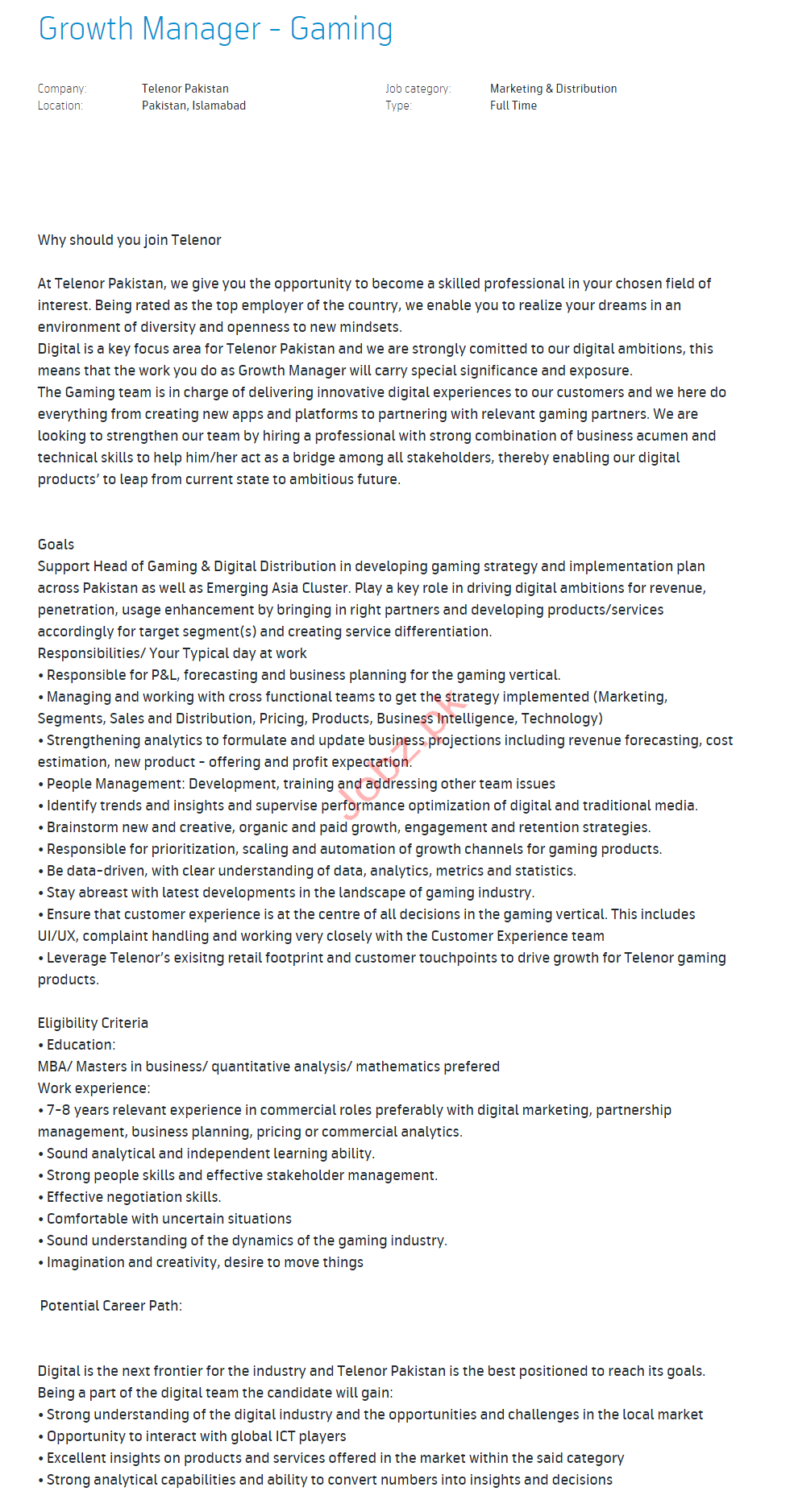 Latest Telenor Pakistan Marketing Posts Islamabad 2025