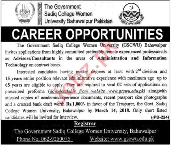GSCWU University Bahawalpur Jobs 2018 For Advisor