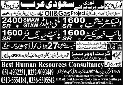 Vacant posts including tubing fitter, electrician, multi welder, pipe fabricator, smaw welder, welder and pipe fitter are announced in Best Human Resources Consultancy Riyadh, jeddah Saudi Arabia as per 25 July 2024 advertisement in daily Express Newspaper. Preferred Education is Intermediate, DAE and Matric etc.