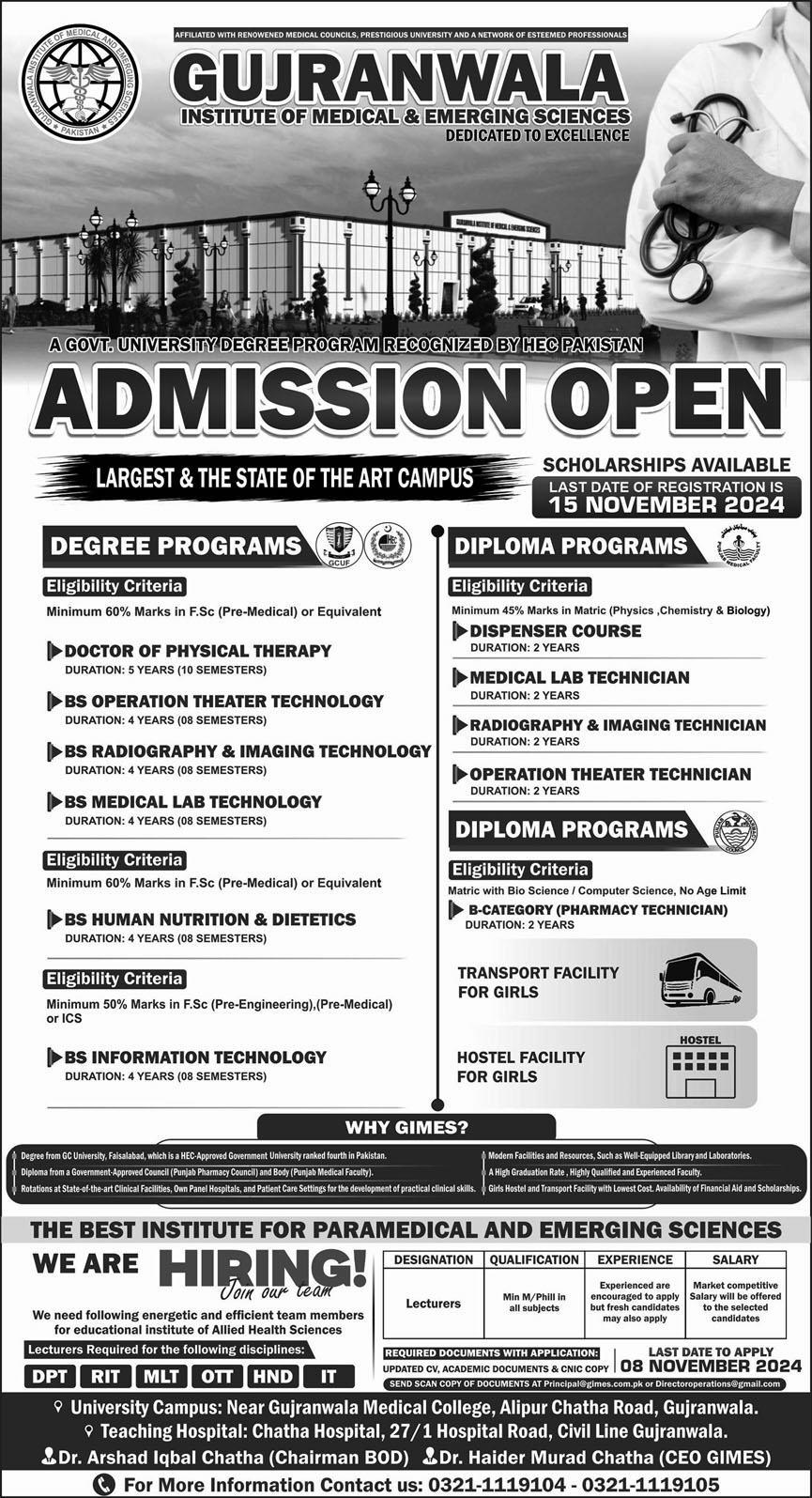 Gujranwala Institute Of Medical & Emerging Sciences GIEMS Doctor of Physical Therapy DPT, BS, Diploma Programs in Dispenser Course, Medical Lab Technician, Radiography & imaging Technician, Operation Theater Technician, B catagory, Pharmacy Technician, admissions 2024 has been started. Eligible students can apply for academic admissions 2024 in Gujranwala Institute Of Medical & Emerging Sciences GIEMS Gujranwala Punjab Pakistan for Medical Medical College. Students for admissions in Course, DPT, BS and B Pharmacy & criteria can apply as per Private institute admission policy 2024 before closing date November 7, 2024 as per advertisement. Read newspaper ad for exact details.