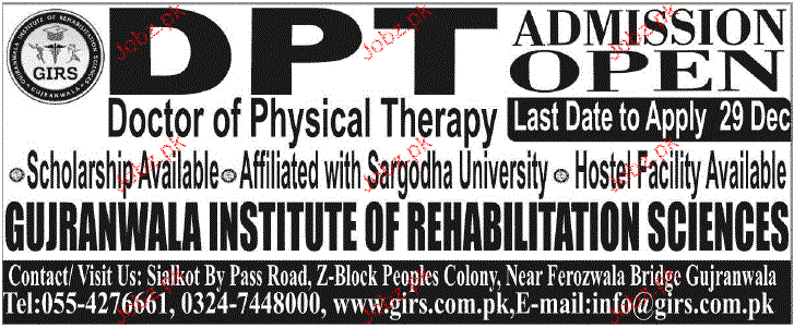 Gujranwala Institute of Rehabilitation Sciences Admission in DPT in Gujranwala Read newspaper ad for exact details.