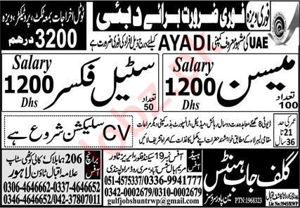 Vacant posts including steel fixer and mason are announced in Gulf Jobs Hunts Manpower Services UAE, dubai UAE as per 29 October 2023 advertisement in daily Express Newspaper. Persons with Primary and Middle etc. education can apply.