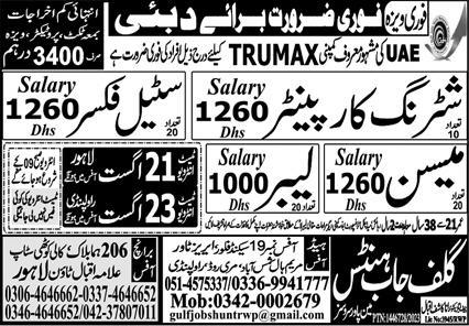 Gulf Job Hunts Manpower Services Dubai, dubai Dubai invites applications from eligible candidates for the post of mason, steel fixer, shuttering carpenter and labor as per advertisement of August 20, 2023 published in daily Express Newspaper. Candidates with Primary, Middle and Matric etc. educational background will be preferred.
