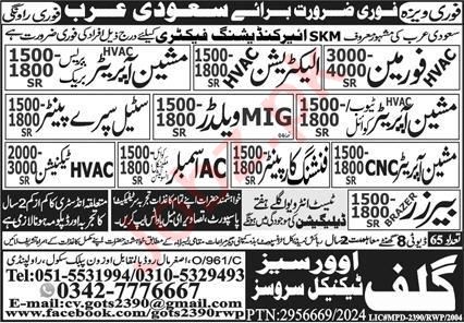 Gulf Overseas Technical Services jobs advertisement dated about 7 October 2024 in daily Express Newspaper invites application for the vacant post of Steel Spray Painter, Finishing Carpenter, Hvac Foreman, Machine Operator, Cnc Machine Operator, Mig Welder, Hvac Electrician, Hvac Technician, Ac Assembler and Bearer in Riyadh, riyadh Saudi Arabia. Candidates with Middle, Intermediate, Matric and Primary etc. educational background will be preferred.