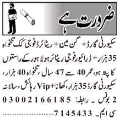 Vacant posts including security guard, cook, driver and gunman are announced in Security Company Lahore, lahore Punjab Pakistan as per 30 May 2024 advertisement in daily Jang Newspaper. Candidates with Matric, Middle and Intermediate etc. educational background will be preferred.