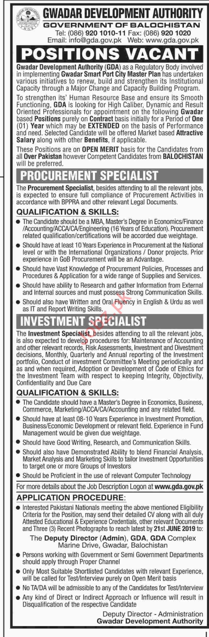 Vacancies in Gwadar Development Authority Advertisement June 2019