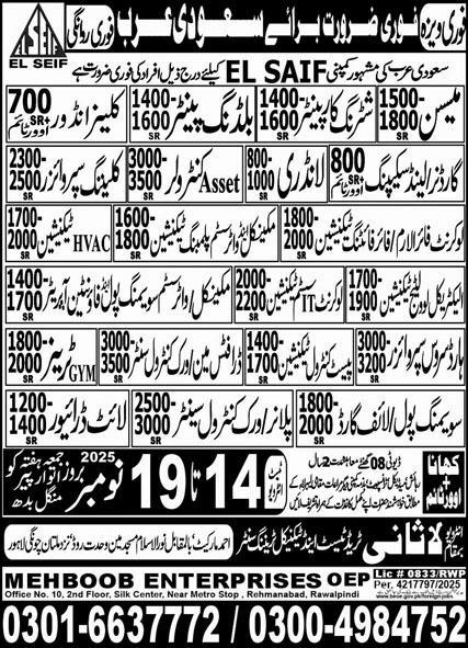 Lasani Trade Test & Technical Training Center invites applications for job positions advertised in daily Express dated 13 November 2025 for following vacancies in Jeddah, dammam Saudi Arabia.
