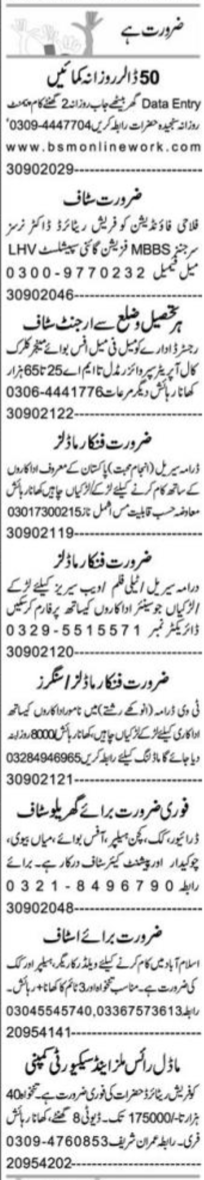 Private Company jobs advertisement dated about 5 December 2024 in daily Express Newspaper invites application for the vacant post of singer, helper, factory worker, model, kitchen helper, security guard, nurse, chowkidar, lady health visitor, supervisor, call operator, security staff, doctor, clerk, welder, husband wife, office boy, patient care, cook, physician, data entry operator, mbbs doctor, actor, manager, gynecologist, driver and lhv in Faisalabad, faisalabad Punjab Pakistan. Preferred Education is Bachelor, Intermediate, DPT, B.com, MBBS, DAE, Matric, Middle and BA etc.