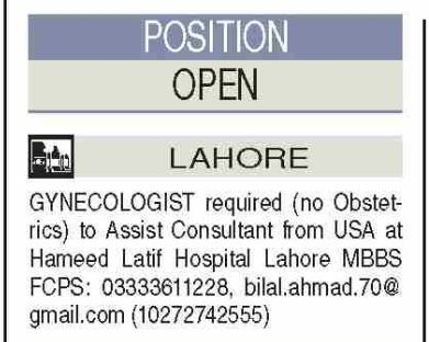 Vacant posts including gynecologist are announced in Hameed Latif Hospital Lahore, lahore Punjab Pakistan as per 25 November 2022 advertisement in daily Dawn Newspaper. Educational qualifications required Others and MBBS etc.