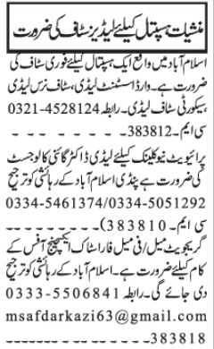 Vacant posts including nurse, lady security staff, gynecologist, office staff, security staff, staff nurse, lady doctor, ward assistant and doctor are announced in Private Company Islamabad, islamabad Islamabad Pakistan as per 4 May 2024 advertisement in daily Jang Newspaper. Bachelor, MBBS and Intermediate etc. educational qualification will be preferred.