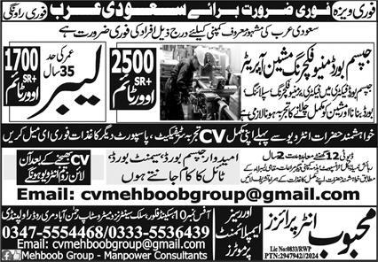 Mehboob Enterprises Overseas Employment Promoters Dammam, taif Saudi Arabia invites applications from eligible candidates for the post of Gypsum Board Manufacturing Machine Operator and Labor as per advertisement of September 28, 2024 published in daily Express Newspaper. Persons with Intermediate, Bachelor, Middle, DAE and Matric etc. education can apply.