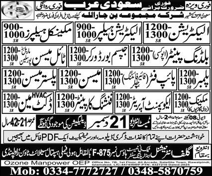 Gulf International jobs advertisement dated about 17 December 2025 in daily Express Newspaper invites application for the vacant post of finishing carpenter, mechanic helper, electrician helper, building painter, electrician, hvac duct man, tile mason, plaster mason, plumber, mason, pipe fitter, equipment operator, duct man, gypsum board worker and mechanic in Riyadh, madina Saudi Arabia. Persons with Intermediate, Matric and Bachelor etc. education can apply.