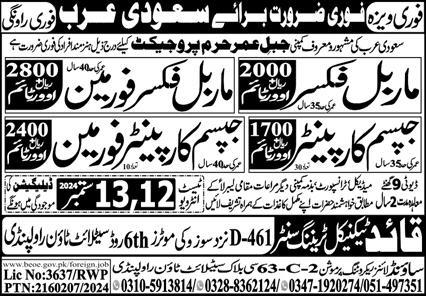 Quaid Technical Training Center Makkah, madina Saudi Arabia invites applications from eligible candidates for the post of marble fixer foreman, marble fixer, gypsum carpenter and gypsum carpenter foreman as per advertisement of September 12, 2024 published in daily Express Newspaper. Educational qualifications required Bachelor, DAE, Matric and Intermediate etc.
