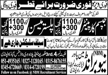 Vacant posts including gypsum carpenter, plaster mason and mason are announced in New Brand Manpower Qatar, qatar Qatar as per 3 January 2024 advertisement in daily Express Newspaper. Matric, Middle and Intermediate etc. educational qualification will be preferred.