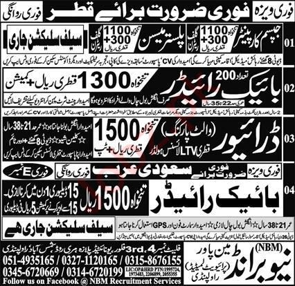 Vacant posts including driver, gypsum carpenter, bike rider, ltv driver and plaster mason are announced in New Brand Manpower Qatar, qatar Qatar as per 7 January 2024 advertisement in daily Express Newspaper. Matric, Bachelor, Intermediate and Middle etc. educational qualification will be preferred.