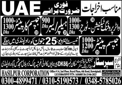 Super Star Technical Trade Test & Training Center jobs advertisement dated about 22 June 2023 in daily Express Newspaper invites application for the vacant post of water proofing technician, gypsum painter, helper, gypsum carpenter and labor in Sharjah, dubai UAE. Preferred Education is Intermediate, DAE and Matric etc.