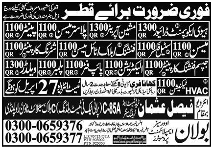 Vacant posts including heavy driver, heavy equipment driver, mason, tile mason, plumber, htv driver, electrician, gypsum finishing carpenter, machine operator, finishing mason, steel fixer, block mason, shuttering carpenter, driver, painter, welder, pipe fitter, plaster mason and hvac technician are announced in Faisal Usman Overseas Employment Promoters Qatar, qatar Qatar as per 25 April 2022 advertisement in daily Express Newspaper. Preferred Education is Middle, Intermediate and Matric etc.